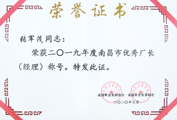 贛昌砂石公司榮獲“2019年度南昌市優(yōu)秀企業(yè)”、“2019年南昌市工業(yè)企業(yè)納稅30強”,總經(jīng)理陳鴻被評為“2019年度南昌市優(yōu)秀企業(yè)家”,副總經(jīng)理張軍茂被評為“2019年度南昌市優(yōu)秀廠長(經(jīng)理)”,綜合部部長袁婧瑛被評為“2019年度南昌市企聯(lián)系統(tǒng)先進個人”。