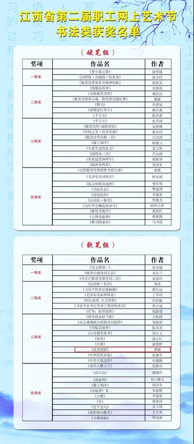 近期,江西省總工會(huì)舉辦了第二屆職工網(wǎng)上藝術(shù)節(jié),我司職工踴躍參與,積極遞交作品。其中譚晨同志以“一手好字”榮獲書(shū)法軟筆組三等獎(jiǎng)。