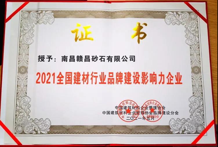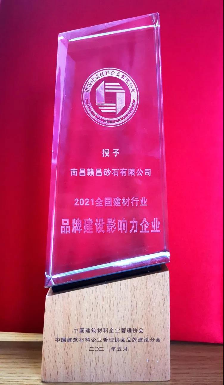 中國建筑材料企業(yè)管理協(xié)會、中國建筑材料企業(yè)管理協(xié)會品牌建設(shè)分會共同在大會上為“2021全國建材行業(yè)品牌建設(shè)影響力企業(yè)”頒發(fā)證書。南昌贛昌砂石有限公司榮獲“2021全國建材行業(yè)品牌建設(shè)影響力企業(yè)”榮譽稱號。