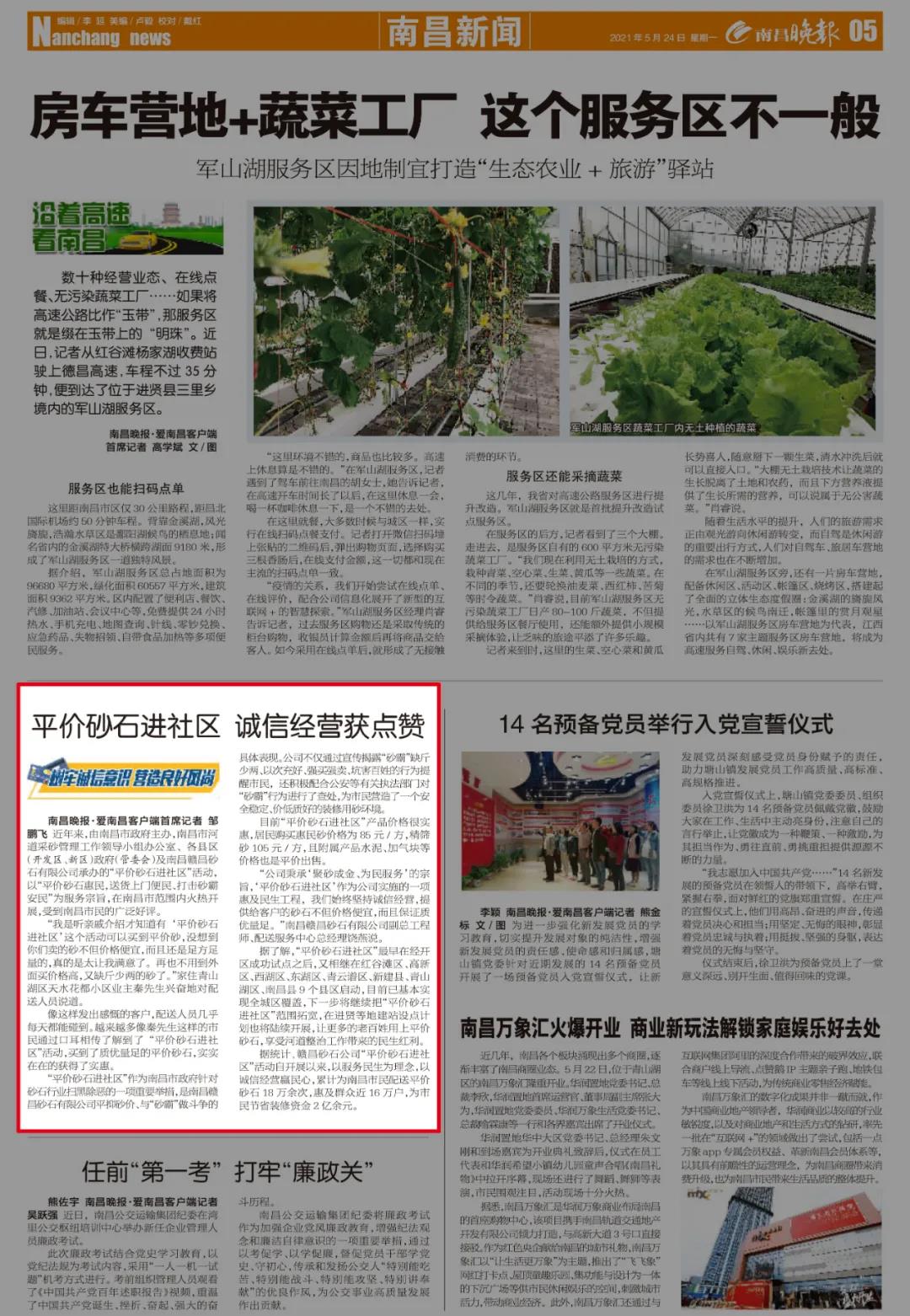 近年來,由南昌市政府主辦,南昌市河道采砂管理工作領(lǐng)導(dǎo)小組辦公室、各縣區(qū)(開發(fā)區(qū)、新區(qū))政府(管委會(huì))及南昌贛昌砂石有限公司承辦的“平價(jià)砂石進(jìn)社區(qū)”活動(dòng),以“平價(jià)砂石惠民,送貨上門便民、打擊砂霸安民”為服務(wù)宗旨,在南昌市范圍內(nèi)火熱開展,受到南昌市民的廣泛好評(píng)。