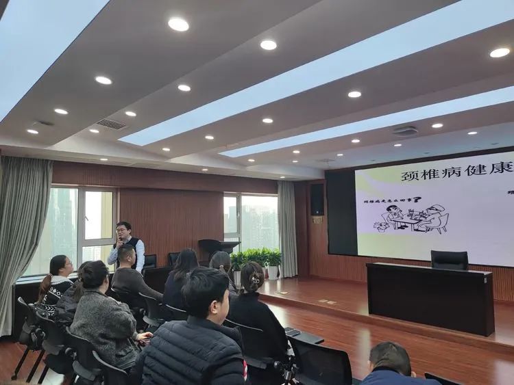 胡主任首先講解了頸椎病的產(chǎn)生原因,從醫(yī)學(xué)理論到日常工作生活習(xí)慣進(jìn)行分析,并以現(xiàn)場同事坐姿舉例講解,讓大家更加清晰直觀的了解頸椎病知識。
