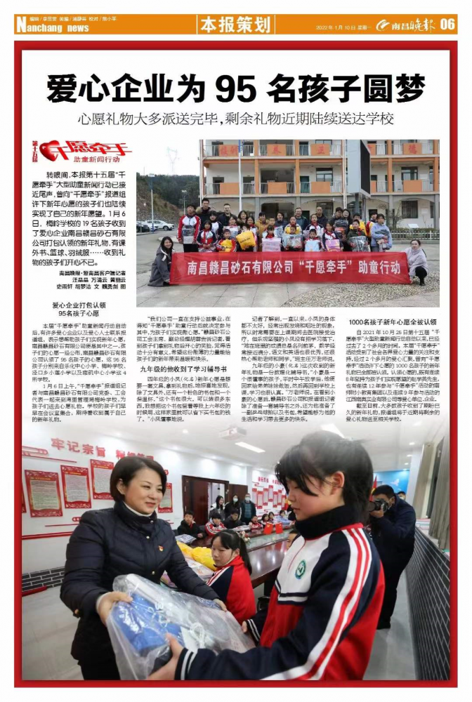 本屆“千愿牽手”助童新聞行動(dòng)啟動(dòng)后,有許多愛心企業(yè)以及愛心人士聯(lián)系報(bào)道組,表示想幫助孩子們實(shí)現(xiàn)新年心愿,南昌贛昌砂石有限公司便是其中之一,孩子們的心愿一經(jīng)公布,南昌贛昌砂石有限公司認(rèn)領(lǐng)了95名孩子的心愿,這95名孩子分別來自樂化中心小學(xué)、梅嶺學(xué)校、涇口鄉(xiāng)小蓮小學(xué)以及南磯中心小學(xué)這4所學(xué)校。