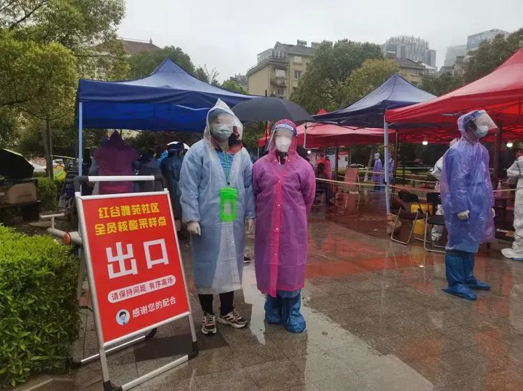早晨七點半,我一到社區(qū)的核酸檢測現(xiàn)場,沒想到雖然今天下雨又降溫,但志愿者們卻熱情不減,早早地就列隊開始工作了。