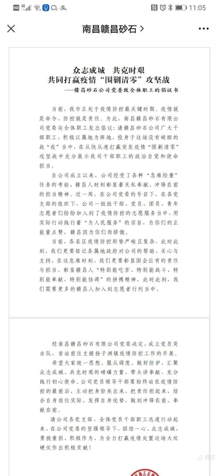 3月18日上午,南昌突發(fā)疫情防控指揮部發(fā)布關(guān)于“從2022年3月18日至3月20日除防疫工作以及生活物資保障人員外,實(shí)行居家辦公或休息”的緊急通知。劉順保接到通知后,立即與市政公用集團(tuán)安監(jiān)(信訪)部聯(lián)系,經(jīng)與贛昌砂石公司班子成員商議后決定,即刻調(diào)整公司防疫工作部署,積極響應(yīng)南昌突發(fā)疫情防控指揮部、市政公用集團(tuán)安監(jiān)(信訪)部通知精神,落實(shí)2022年3月18日至3月20日居家辦公要求。