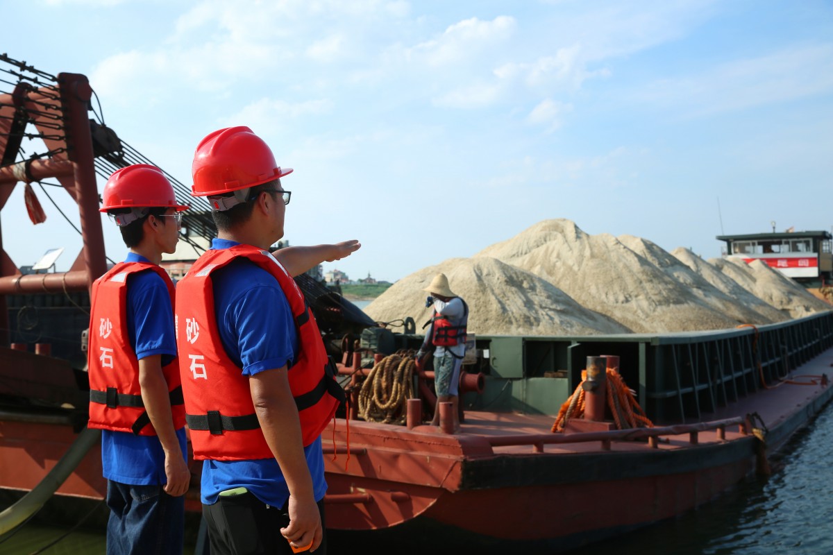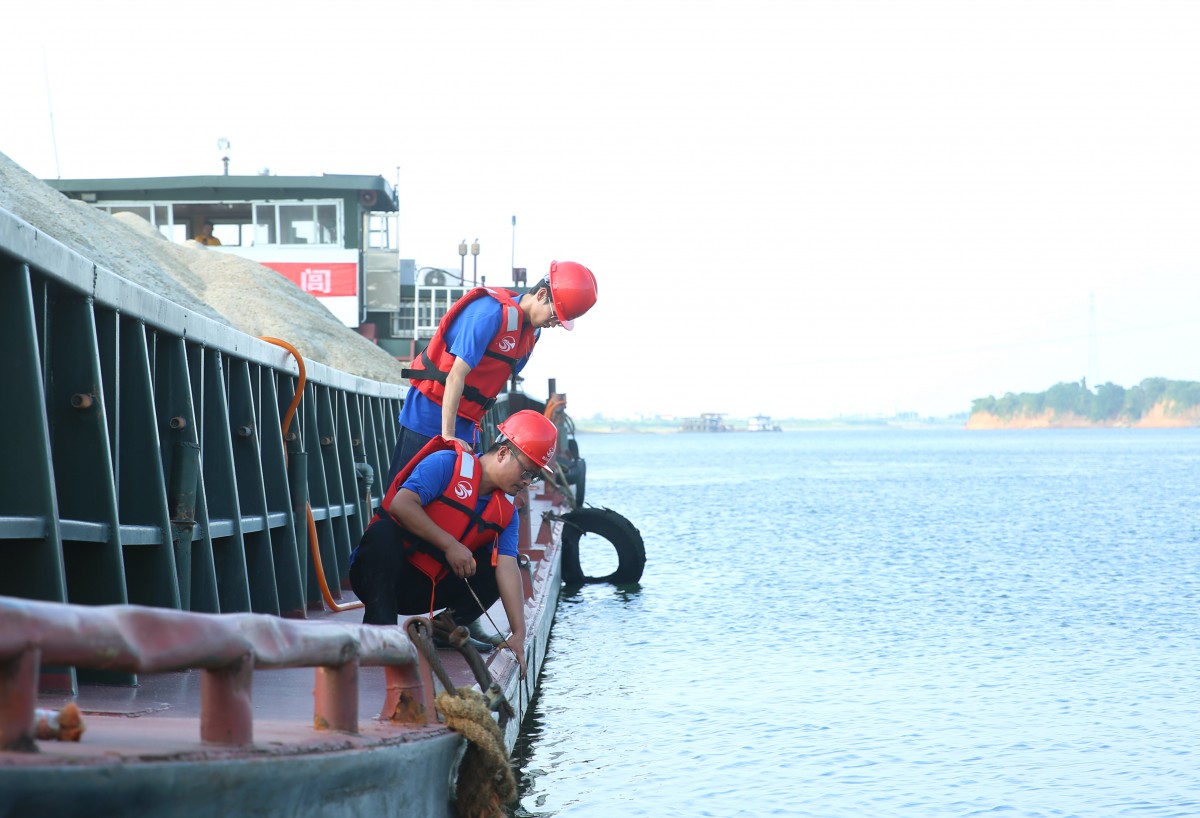 發(fā)貨員陶小毛、熊劍的身影出現(xiàn)在烈日下,在江邊等待著即將靠岸的運(yùn)力船,為了安全他們頭戴安全帽、身穿印有贛昌砂石logo的紅色救生衣、腳踩套鞋,這身裝備仿佛將他們整個(gè)人置身于密不透風(fēng)的高溫鐵桶里,即使什么都不做都能出一身汗,更別說(shuō)要登上被陽(yáng)光曬得燙腳的鐵皮甲板了。但他們依舊仔細(xì)核對(duì)著運(yùn)砂船的各項(xiàng)數(shù)據(jù),做著砂石入庫(kù)前的準(zhǔn)備,仿佛忘記從四面八方襲來(lái)的滾滾熱浪。