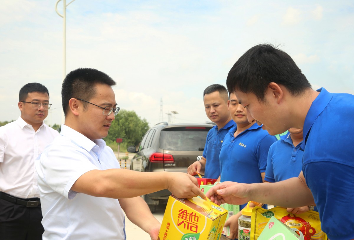 7月26日,南昌交投集團(tuán)高管,原南昌水投董事、副總經(jīng)理陳鴻一行赴贛昌砂石公司高新銷售中心尤口砂場(chǎng)看望慰問(wèn)堅(jiān)守在一線的職工,為他們送去防暑降溫物資。南昌交投集團(tuán)黨群工作部副部長(zhǎng)李凌清、安全生產(chǎn)部相關(guān)人員,贛昌砂石公司黨委書記、董事長(zhǎng)唐曉飛,總經(jīng)理助理葉劍飛等陪同。